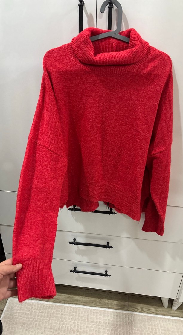 Kadınlar için yüksek yakalı, uzun kollu ve bol kesim örgü kazak. Rahat ve sıcak dokusu, gündelik sokak stili için uygundur. Canlı kırmızı renkte, desensiz ve midi boyda.