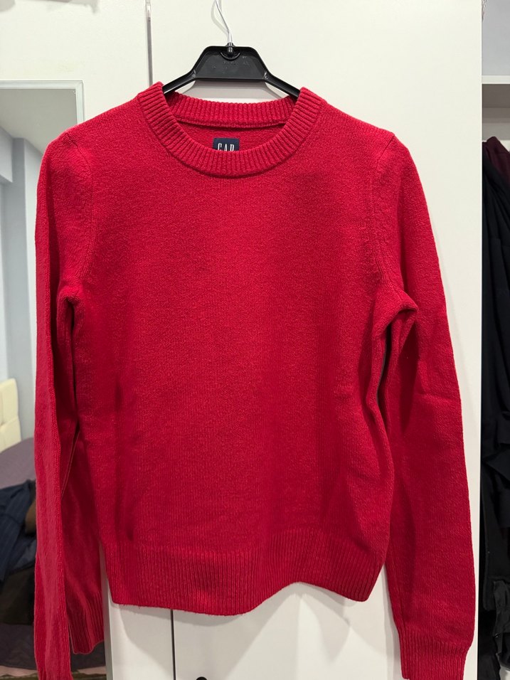 Kadınlar için parlak kırmızı renkte, bisiklet yaka ve uzun kollu yün kazak. Bol kesim, örgü dokusu ve rahat sokak stili sunar.