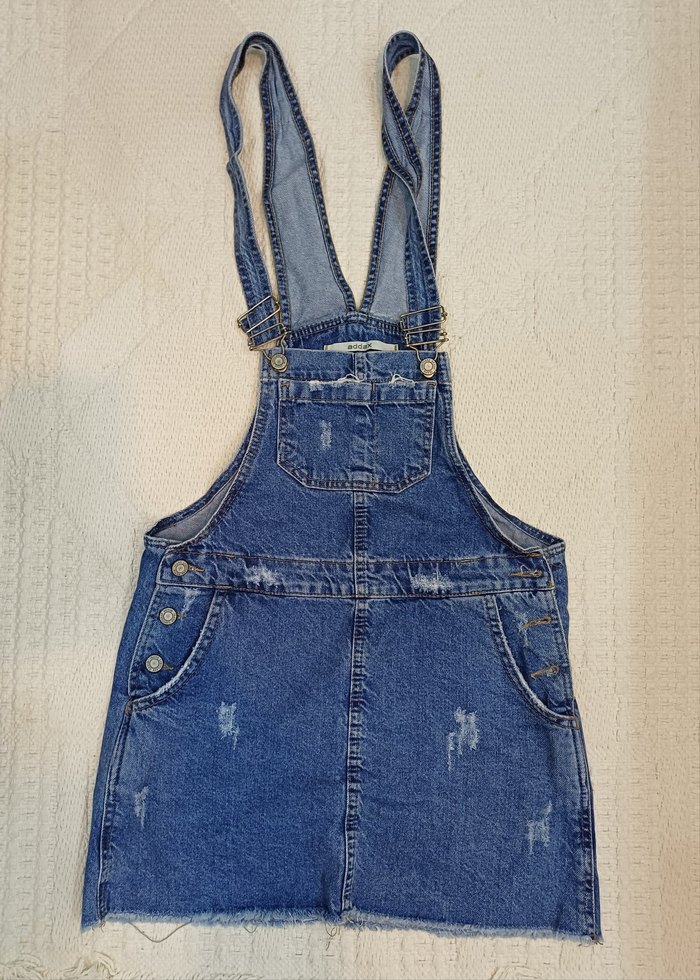 Mavi denim kısa salopet, bol kesim, tokalı askılar ve straplez yakaya sahip. Günlük rahat kullanım için uygundur.