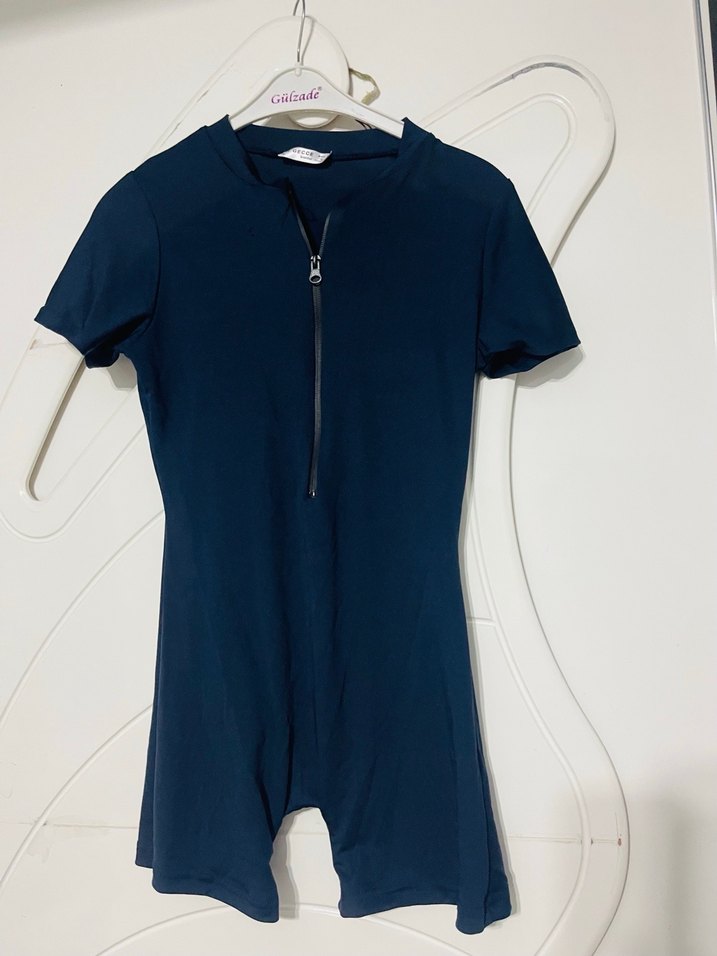 Dar kesim, kısa kollu ve yüksek yakalı kadın tulumu, ön fermuarlı. Koyu mavi sentetik kumaştan, günlük kullanıma uygun sokak stili tulum.