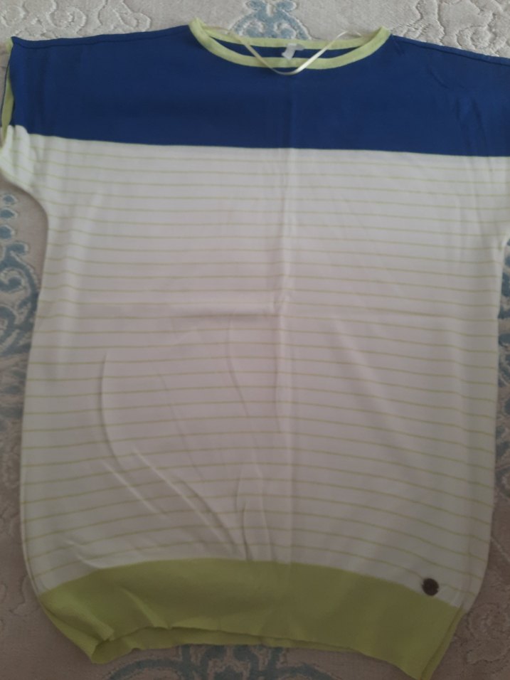 Kadın tişörtü, yuvarlak yaka ve kısa kolludur. Beyaz zemin üzerine ince çizgiler ve pile detayları vardır. Sentetik kumaştan üretilmiş, rahat kesim ve günlük kullanıma uygundur.