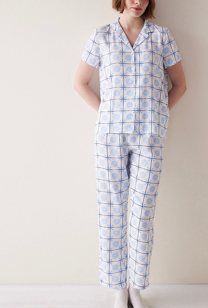 Kadınlar için beyaz ve mavi tonlarda pastel tie-dye desenli, kısa kollu, pijama takımıdır. Rahat ve gündelik tarzda tasarlanmıştır.