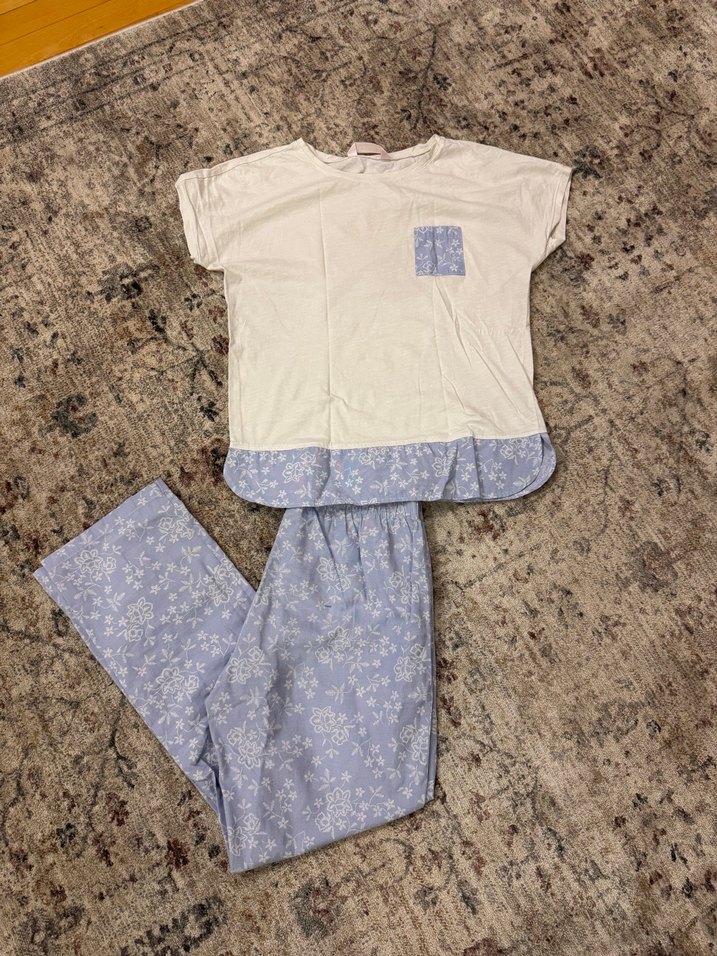 Kısa kollu pijama takımı. Mavi yerler paraşüt kumaş gibi bir kumaş.Pantolon bel 37 cm. Boy 100cm arka kısmında bir yırtık var fotoğrafa ekledim. Üst boy 65 cm. En 47 cm. Başka bir sıkıntı yok artık giymediğim için satıyorum