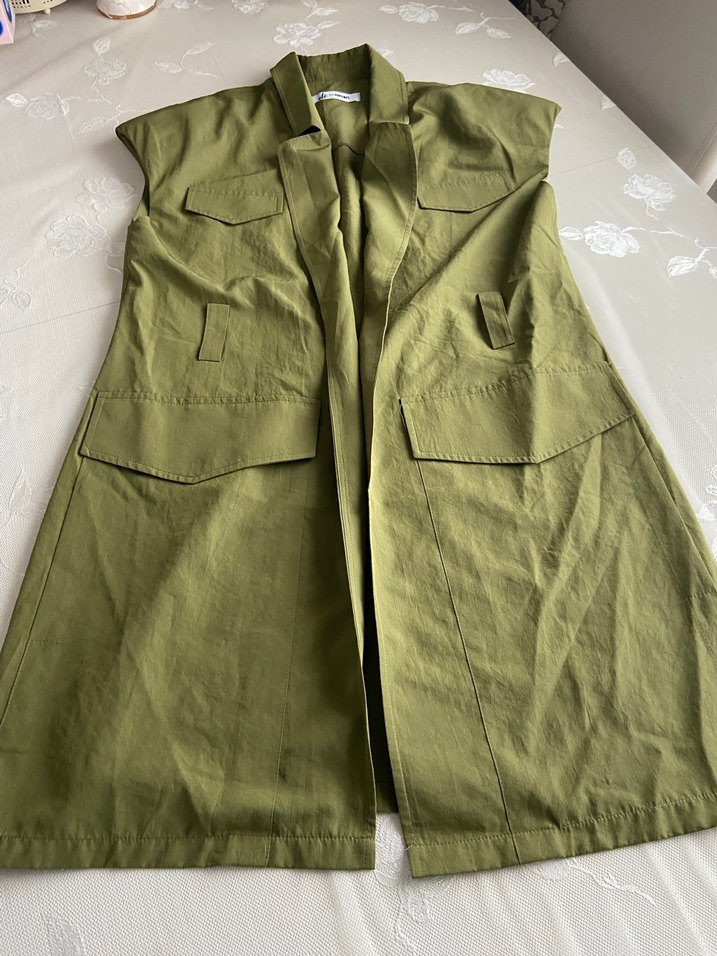 Kadınlar için uzun, kolsuz, parlak haki renkte yumuşak kumaştan yapılmış yelek. Kemeri yok kesik yakalı ve çoklu ceplidir. Minimalist sokak tarzı için idealdir.