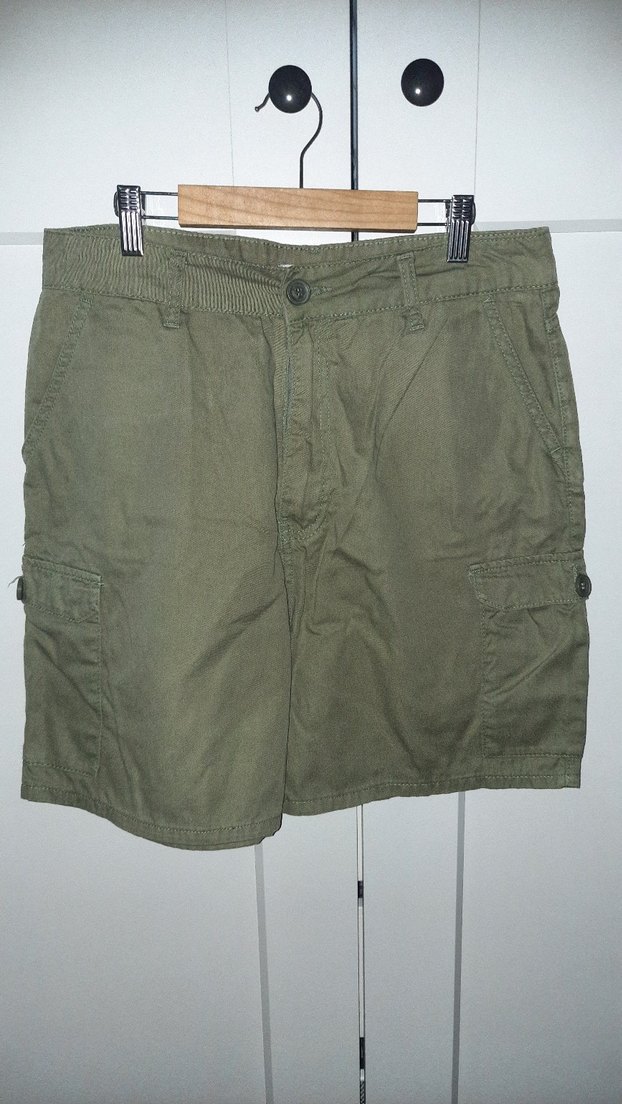 Bol kesim, koyu haki renk kısa şort. Rahat ve günlük dış mekan kullanımı için uygun.