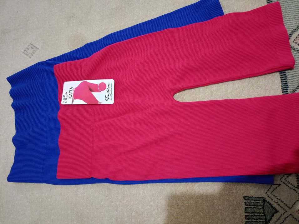 2 tane etiketli tayt. Renkli pembe, elastik kumaştan yapılmış, spor için uygun, normcore tarzında, vücuda oturan tayt