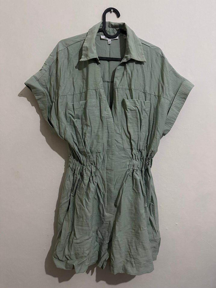 Kadınlar için bol kesim, kısa kollu, yakalı ve kemerli tulum.