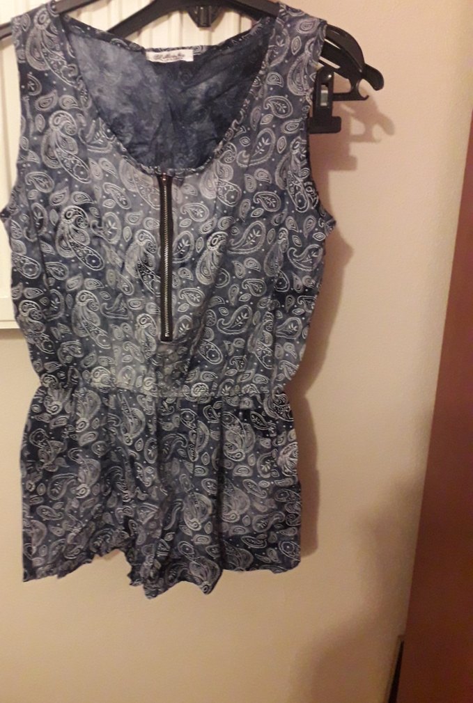 pamuku kumaştan, kolsuz ve straplez kısa tulum. Bol kesim, ön fermuarlı ve paisley desenli. Bohem, retro tarzıyla günlük kullanıma uygun.boy 71 iki koltuk arası 48cm beden yazmıyor ceplidir