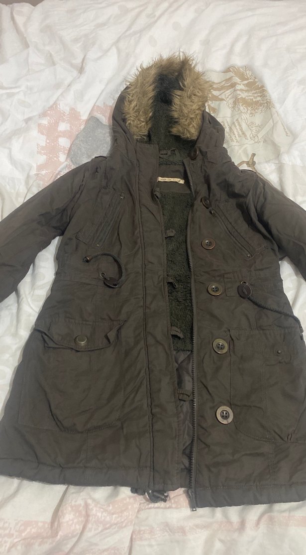 Koyu yeşil, kürklü kapüşonlu, uzun kollu ve cep detaylı, normal boyda kadın kışlık mont. İç kısmı sıcak tutan yumuşak kumaşla kaplıdır. ❄️34 beden