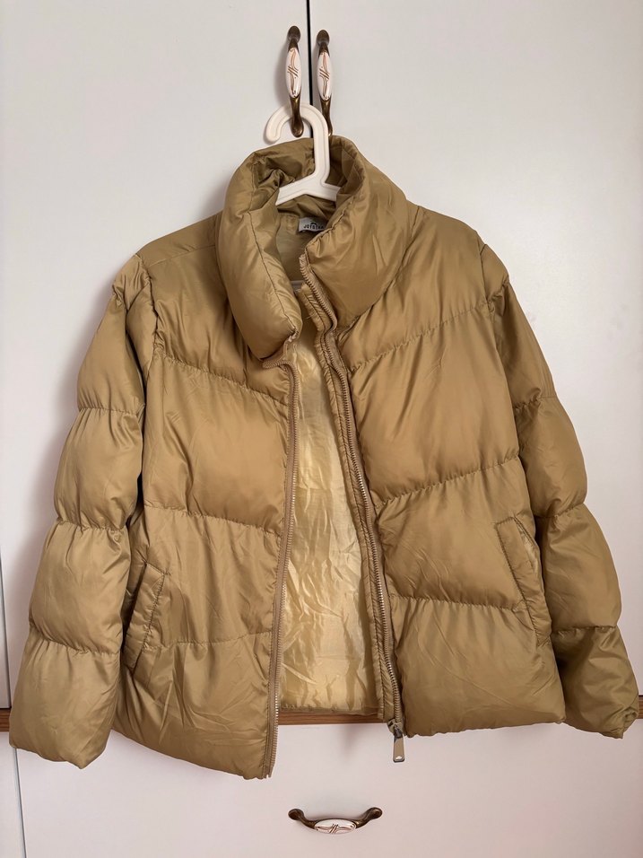 Yağ yeşili renkli, yüksek yakalı ve uzun kollu kadın kışlık mont.fitted kesimiyle günlük kullanıma uygun sade ve rahat tasarım.