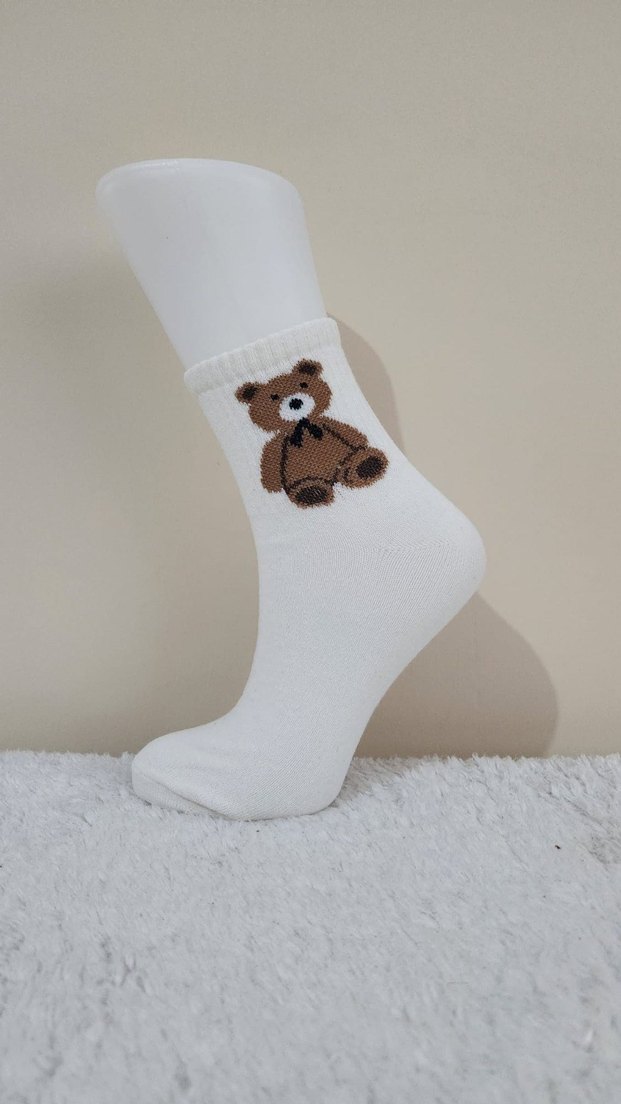 Yumuşak ve sıcak dokulu beyaz kadın kız çorabı, renkli nakışlı ayıcık deseniyle.