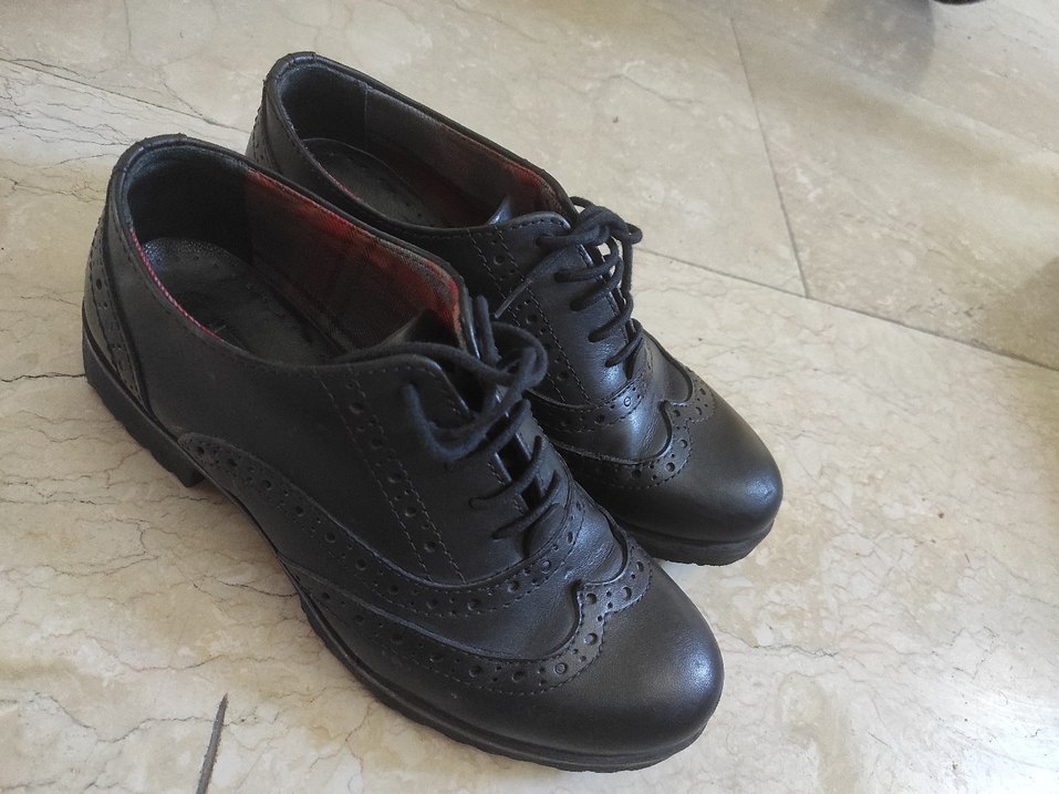 Siyah deri kadın klasik ayakkabılar, dolgu topuklu, bağcıklı ve tokalı detaylara sahip. Ofis için uygun, desen içermeyen koyu renkte. hiçbir sorunu yok fazlaliktan satışta
