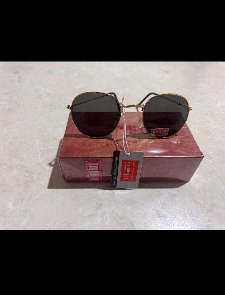 Kadınlar için koyu renkli lenslere sahip altın çerçeveli güneş gözlüğü. Klasik ve trend bir görünüm sunar