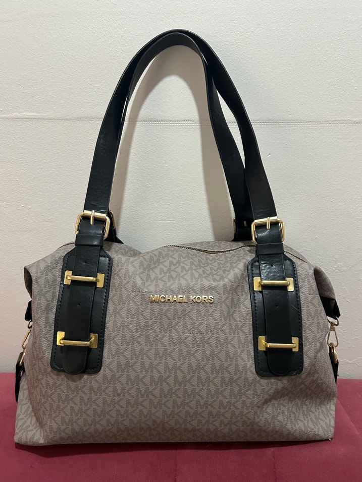 Bej renkli, deseni baskılı kadın çantası, siyah tokalı askılarla iş ve günlük kullanıma uygun.