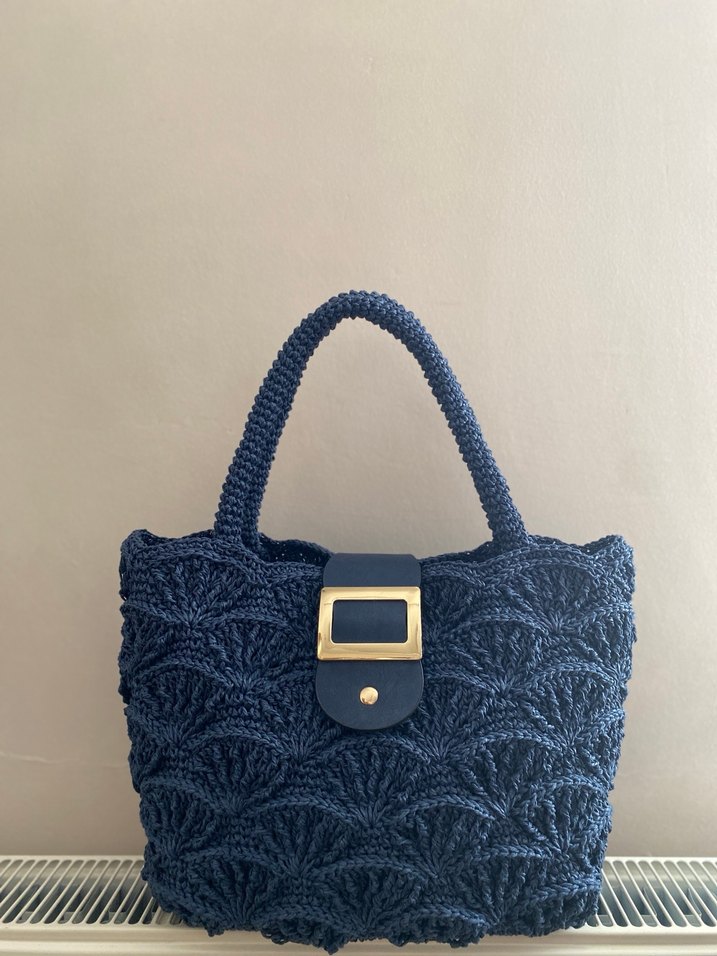 Lacivert renkli, örgü dantel dokulu, altın detaylı tokasıyla günlük kullanıma uygun minimalist ve bohem tarzda kadın çantası.