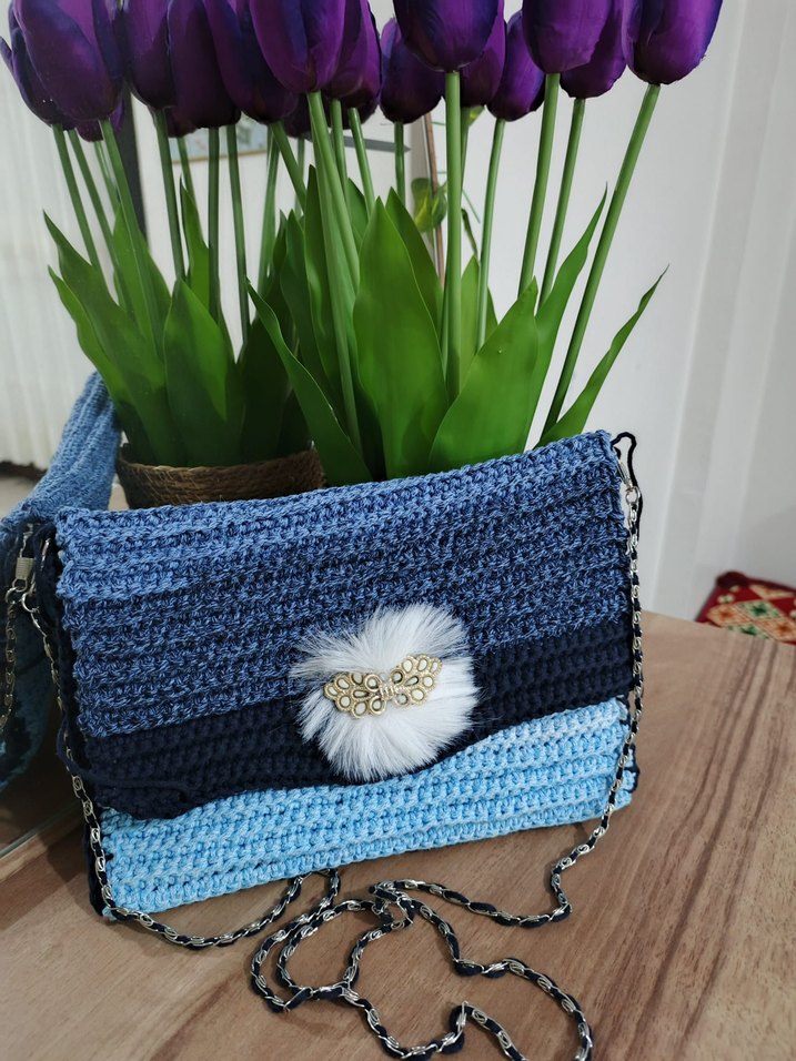 Bohem tarzda, örgü mavi renkli, bağlama desenli kadın çanta., zincir askılı, günlük kullanıma uygun.