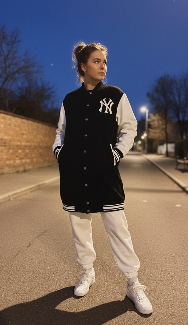 Düğmeli, yüksek yakalı, uzun kollu siyah kolej ceket. Kolej tarzı spor tasarım, günlük rahat kullanım için uygundur. ⚾