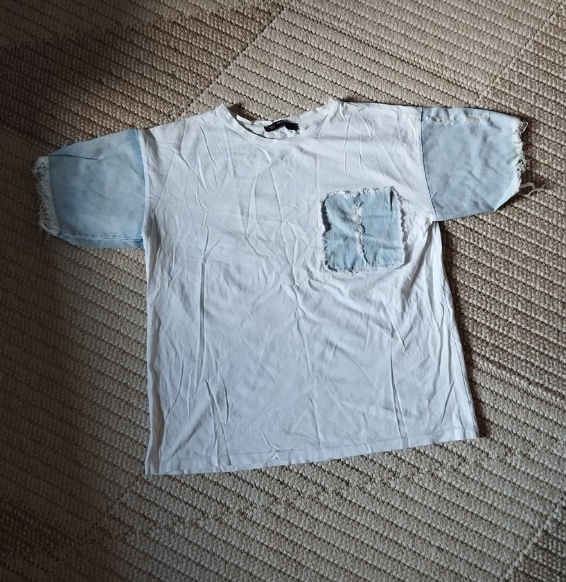 Kadın bol kesim, kısa kollu ve bisiklet yaka tişört. Beyaz gövde, kot kollar ve cep detayıyla rahat bir sokak stili sunar. Ön tarafında aşağı doğru minik bi lekesi var belki çıkar çekerken farkettim.