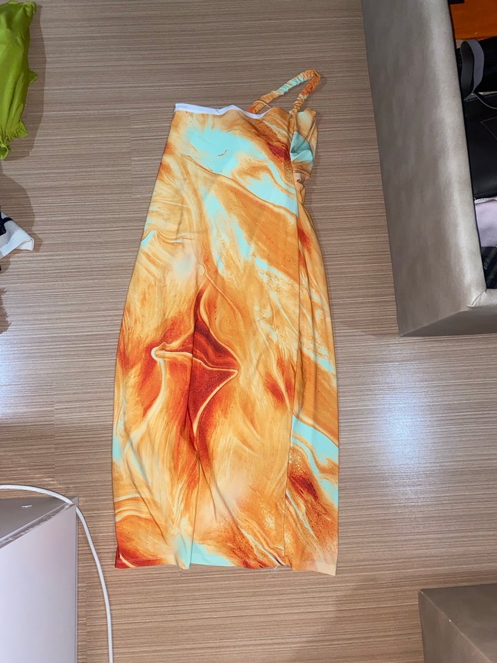 Kolsuz, straplez uzun elbise, dar kesim ve drapeli tasarıma sahip. Hafif çok renkli batik desenli ve sentetik kumaştan üretilmiştir. Bohem tarz için uygundur. . HİÇ KULLANILMADI
