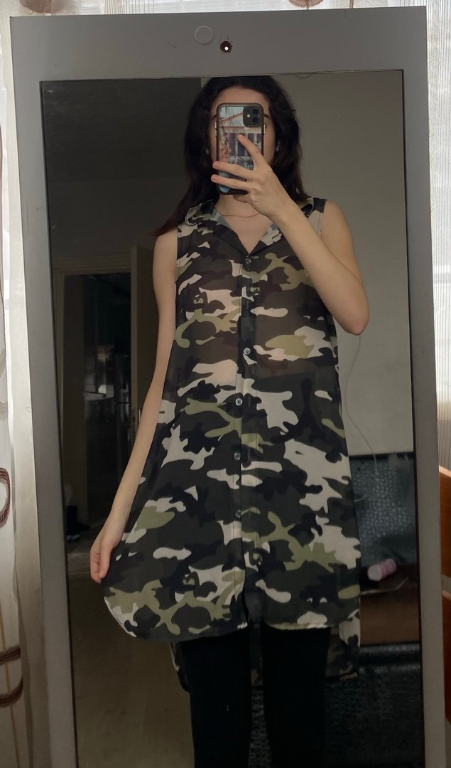 Kolsuz, straplez yakalı, düğmeli ön cepheli, bol kesim midi elbise. Koyu haki kamuflaj desenli, sentetik kumaştan, günlük rahat kullanım için uygundur.
