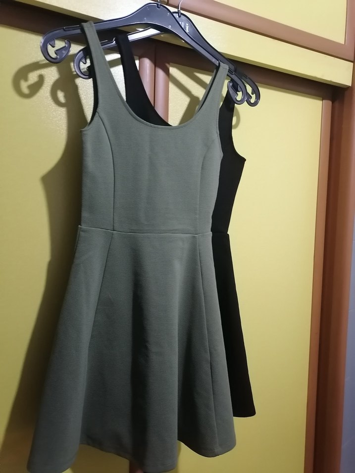 Kolsuz, pilili, fitted kesim haki ve siyah midi elbise, yumuşak kumaştan günlük kullanım için uygun. ✨#koton #zara #mudo#mango #mango #h&m