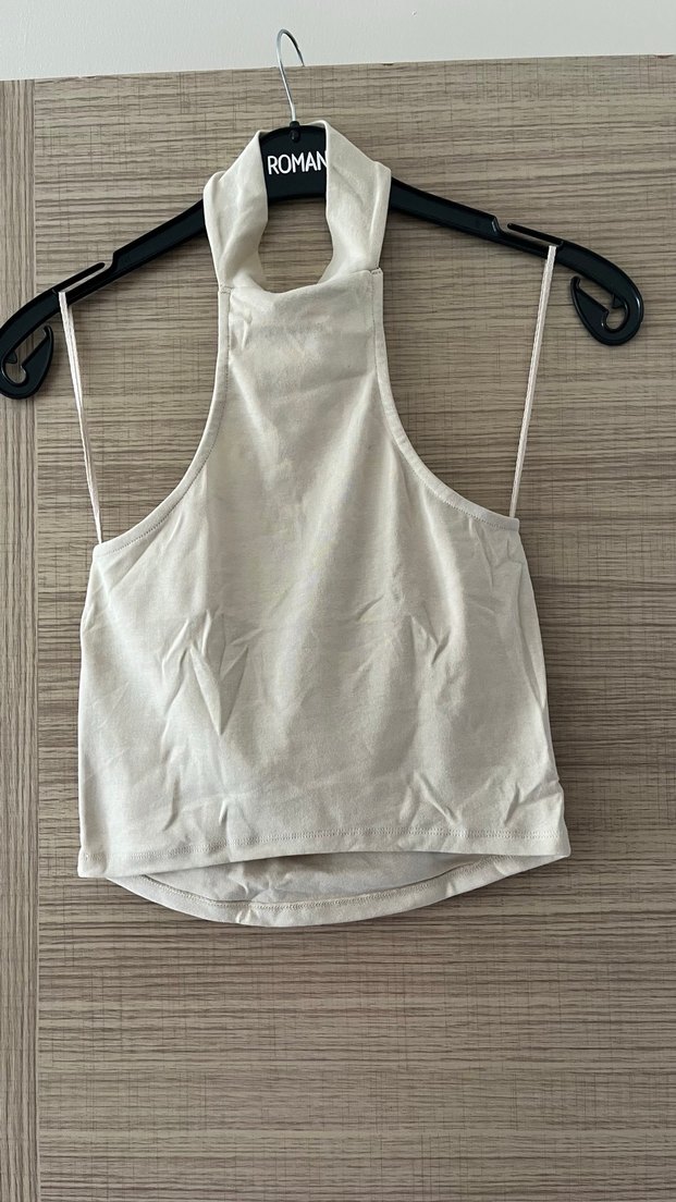 Bej rengi kolsuz keten mini üst, yüksek yakalı ve vücuda oturan kesime sahip. Minimalist, sade ve günlük kullanıma uygun şık bir modeldir. ️