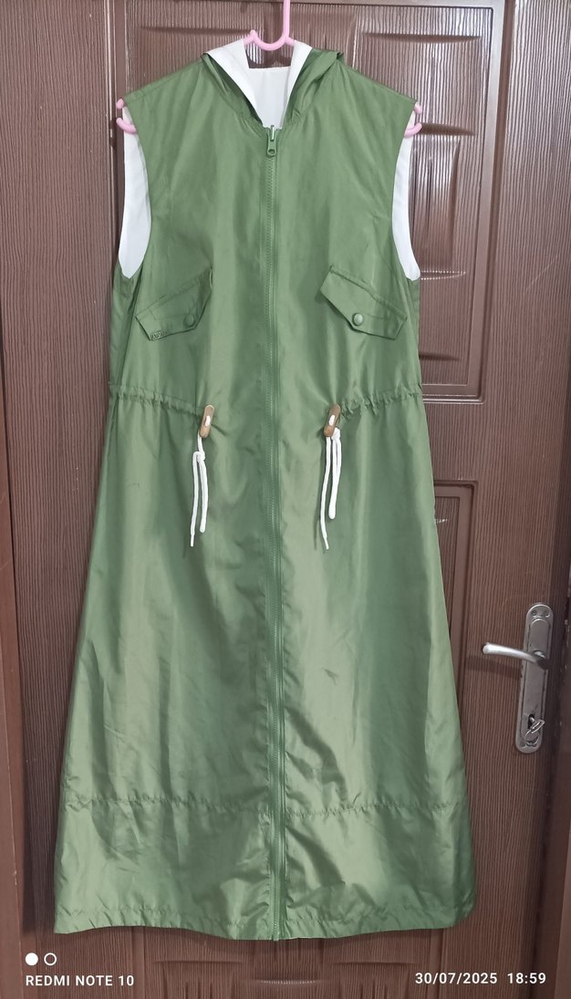 Kolsuz uzun haki renk yağmurluk, fermuarlı ve ayarlanabilir bel detaylıdır.paraşüt kumaştan yapılmış, rahat kesimdir ve günlük kullanım için uygundur.hiç giyilmemiştir orijinal Armine marka içinde iki tarafındada cebi vardır hiçbir defosu yoktur boyu 113 beli ayarlanmadan 42 cm