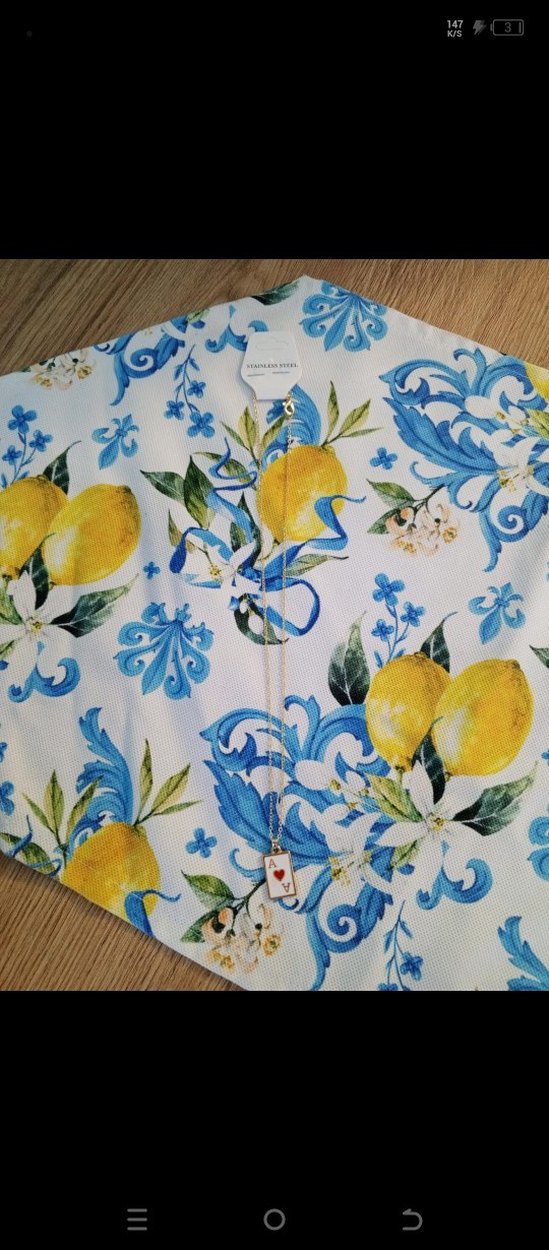 Beyaz zemin üzerinde sarı limon ve mavi çiçek desenleri bulunan mutfak önlüğü, mutfağınıza ferah bir hava katar.