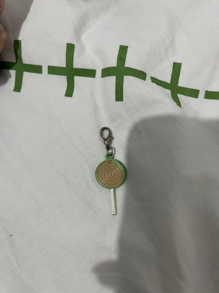 Parlak yeşil renkte, spiral desenli yuvarlak bir figür ve püskül içeren bohem ve grunge punk tarzında anahtarlık. Kolay kullanım için mandallı toka bulunur. ️