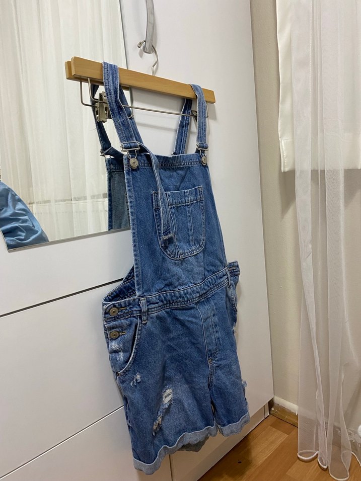 Mavi kot kumaştan, askılı ve toka detaylı, bol kesim kısa tulum. Straplez yakaya sahip, günlük sokak stiline uygun.