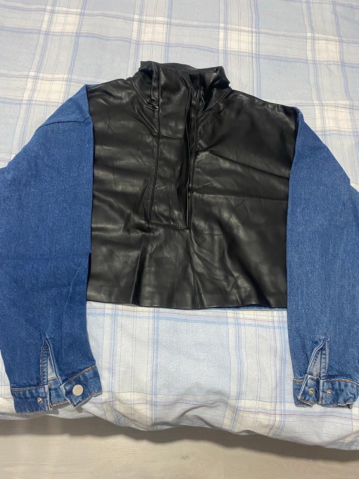 Ön kısmı suni deri arka kısmı kot kumaşından. Uzun kolludur, ön kısmı çıtçıtlıdır. Crop tarzı.