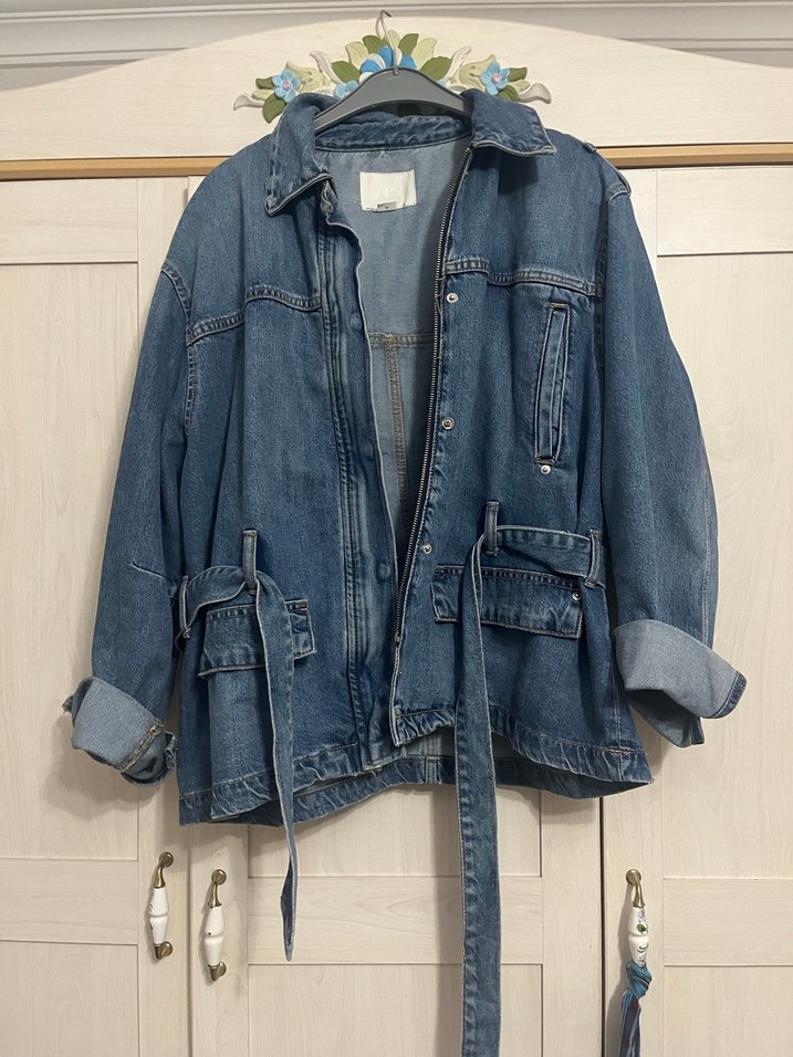Mavi kot ceket, kemerli ve rahat kesimli, notlu yakalı tek bir düğmesi koptu başka bir sorunu yok