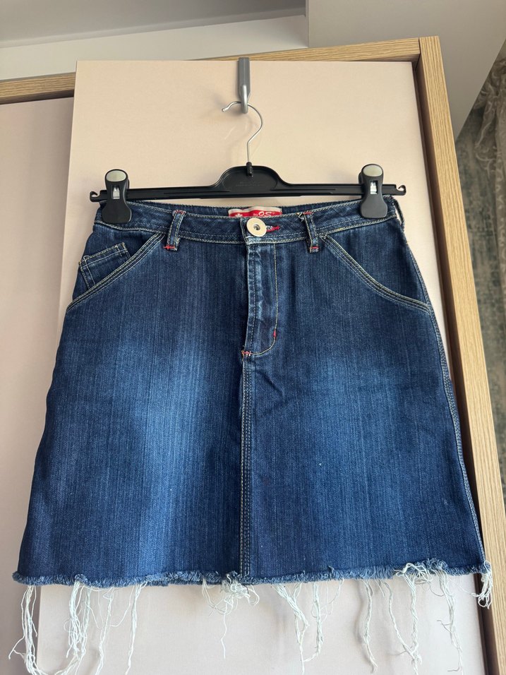 Parlak lacivert kot mini etek, bol kesim ve tokalı detaylarla günlük kullanıma uygun rahat ve asi bir tarz sunar. Normal midi uzunlukta, uçları püsküllü.