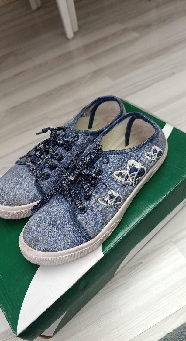 Mavi kot kumaştan, nakışlı kelebek desenli kadın spor ayakkabısı. Dolgu topuklu ve cırt cırtlı, renkli detaylara sahip. Rahat sokak stili için uygun. 2defa kullandım