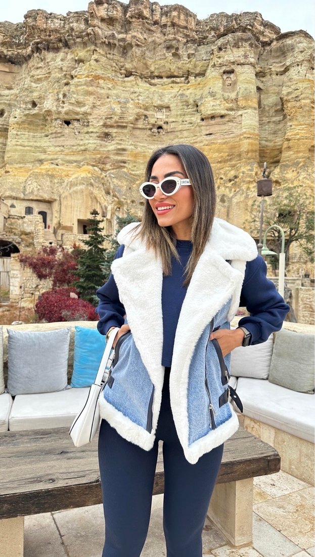 Kadınlar için kısa kesim, kolsuz kot mont, kürk detaylı ve regular fit. Mavi ve gri tonlarda, bağlama desenli, günlük kullanım için uygundur. ❄️