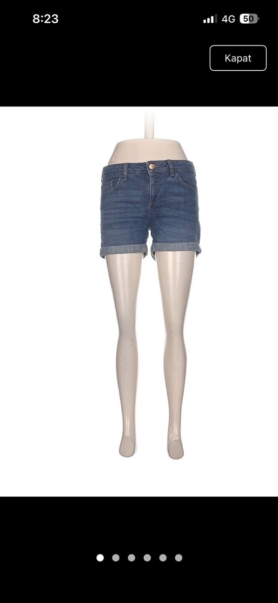 Koyu mavi kot kumaştan, dar kesim mini şort, katlanmış paça detaylı, günlük rahat kullanım için ideal. S ve M bedene uygundur
