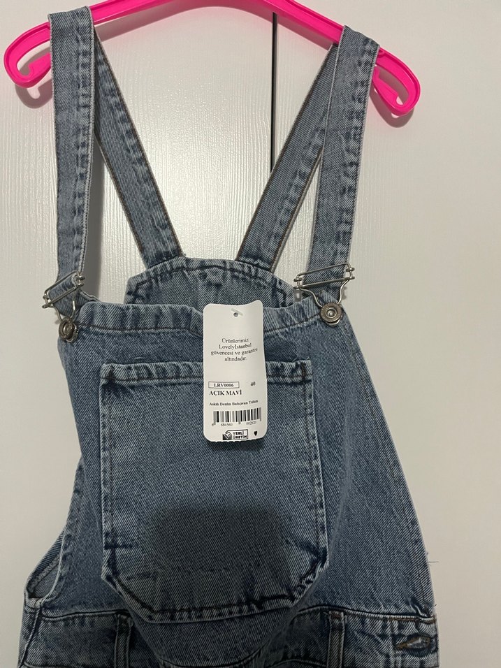 Açık mavi kot kumaştan, ayarlanabilir tokalı askılı, arka ve ön cepli, mini boy kadın tulum, günlük rahat kullanım için uygundur. Göğüs altı 86 Kalça kısmı 100