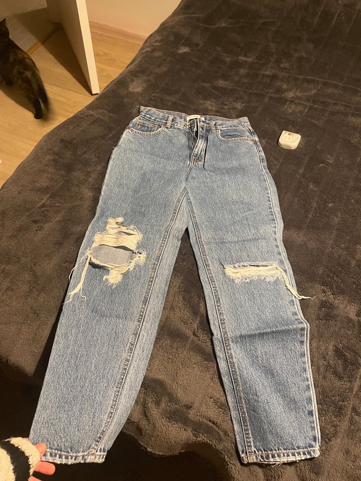Kot kumaştan yapılmış, yırtık detaylı mavi boy kot pantolon. Sokak stiline uygun rahat kesim, yırtık detaylı.