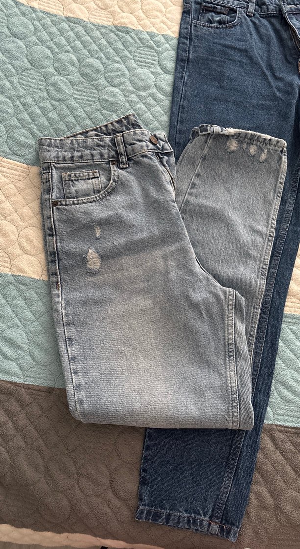 Kadınlar için açık mavi renkte pantolon. Kot kumaşından, tokalı detaylı, hafif yırtıklarla günlük kullanıma uygun.
