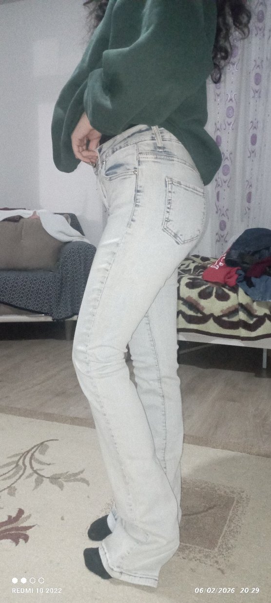 dar kesim geniş paça kot pantolon. Günlük kullanıma uygun rahat ve şık bir sokak stili parçası.