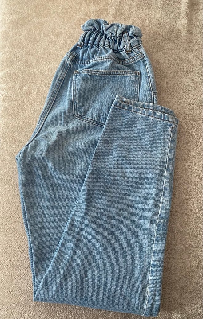 Beli kemerli, pastel mavi renkte kadın kot pantolon.