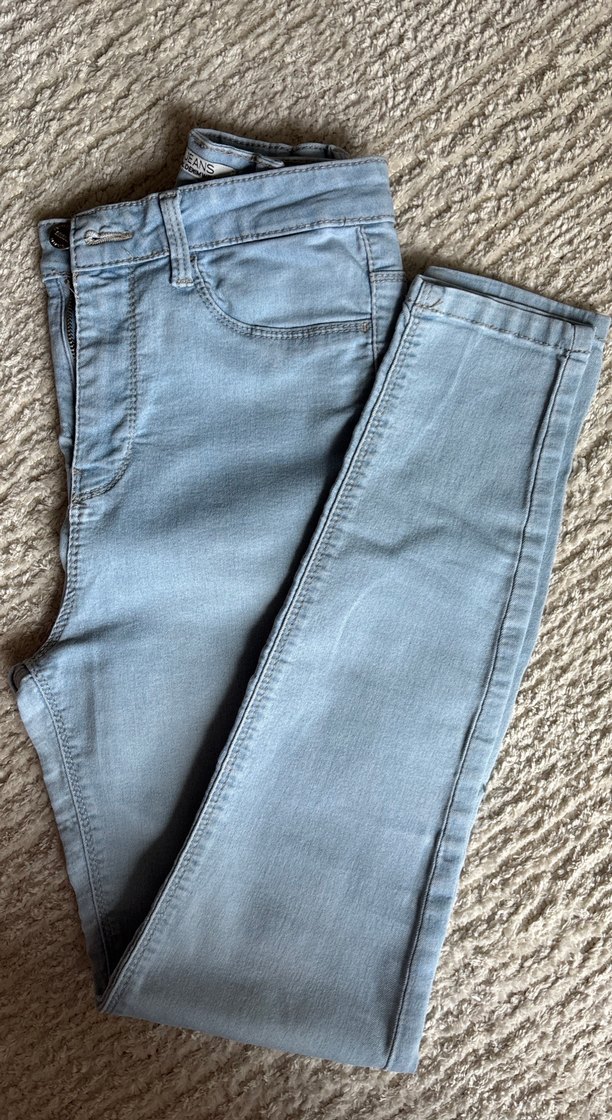 Yumuşak denimden yapılmış dar kesim dar paça super skinny model xs-s uyumlu yüksek bel açık mavi renk defo yok az giyildi belinde 2 pens var açtırılabilir