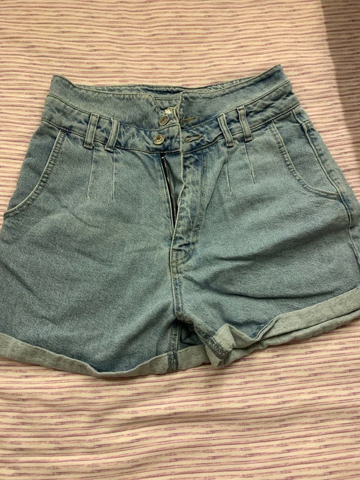 Düğmeli, bol kesim bej mini denim şort, günlük kullanıma uygun rahat bir sokak stili sunar.