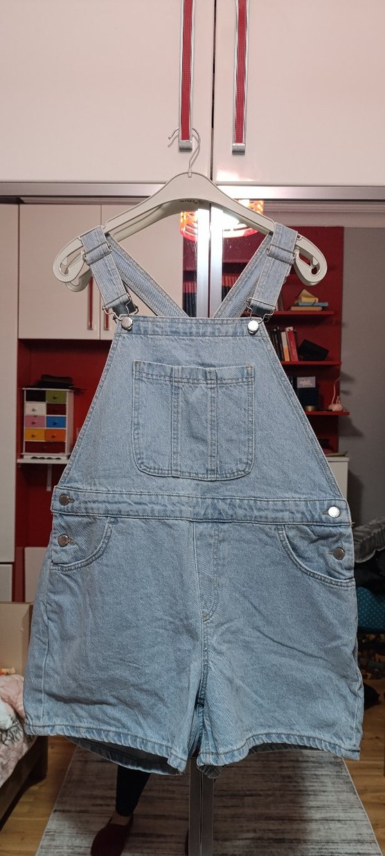 Kadınlar için rahat kesim, kot şort tulum askılı ve tokalı detaylarla. Ön cep ve mavi renkte, günlük rahat stil için uygundur.