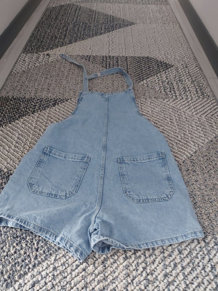 Askılı, rahat kesim kot şort tulum. İki ön cep bulunur. Trendy ve günlük kullanım için uygundur.