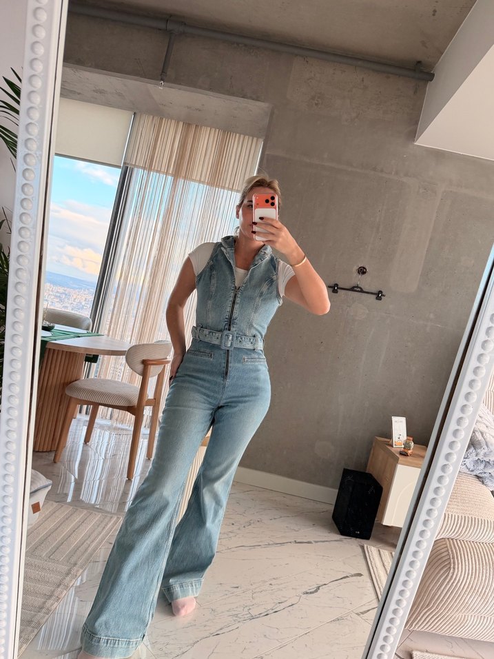 Kadınlar için kot tulum, kemerli, kolsuz ve straplez. Günlük kullanıma uygun rahat ve trend bir tarza sahiptir. Sadece 1 defa giyilmiştir