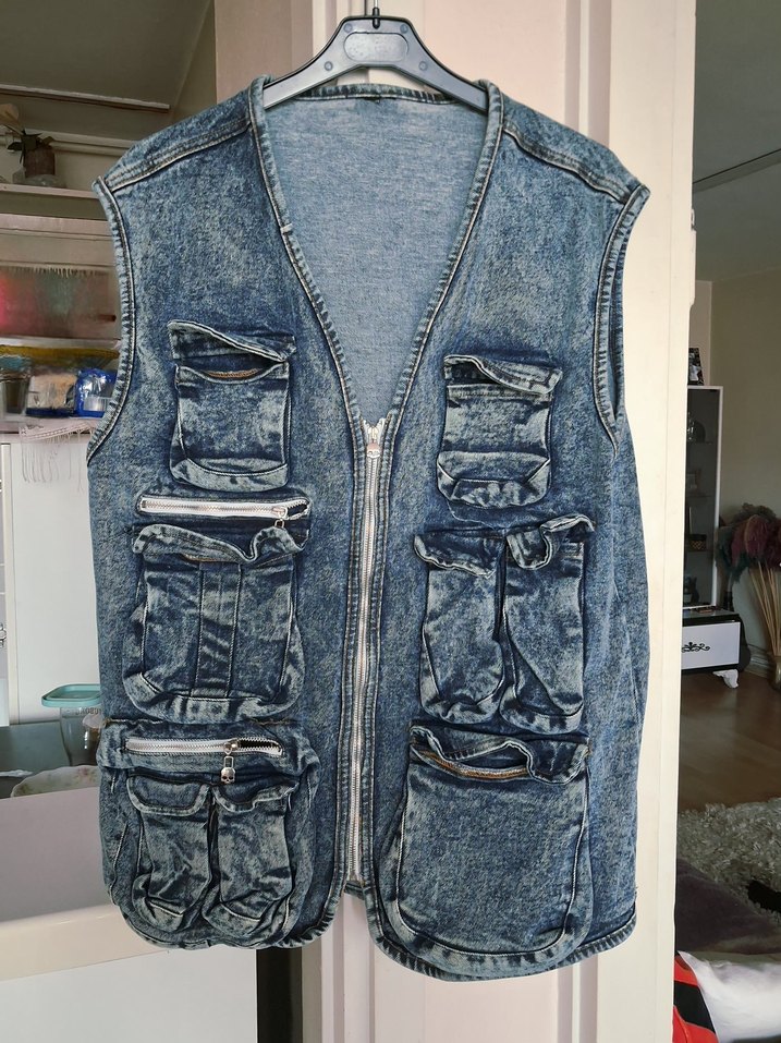 Fermuarlı çoklu cepleri ve askısız yakasıyla, mavi yıkamalı, kolsuz denim yelek. Normal midi boyda, günlük rahat tarz için uygun.