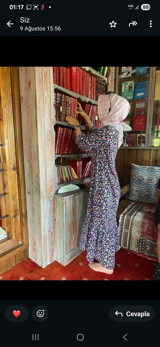 Pamuk kumaştan, uzun kollu ve yuvarlak yaka olan bu kadın uzun elbise, koyu camel deseni ve bol kesimiyle bohem tarzı yansıtır.