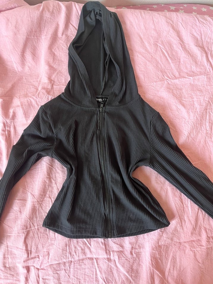 kadınlar için koyu gri, fitilli ve fermuarlı bu ceket yüksek yakalıdır. Yumuşak sentetik kumaştan yapılmış, gotik tarzda kapüşonludur.
