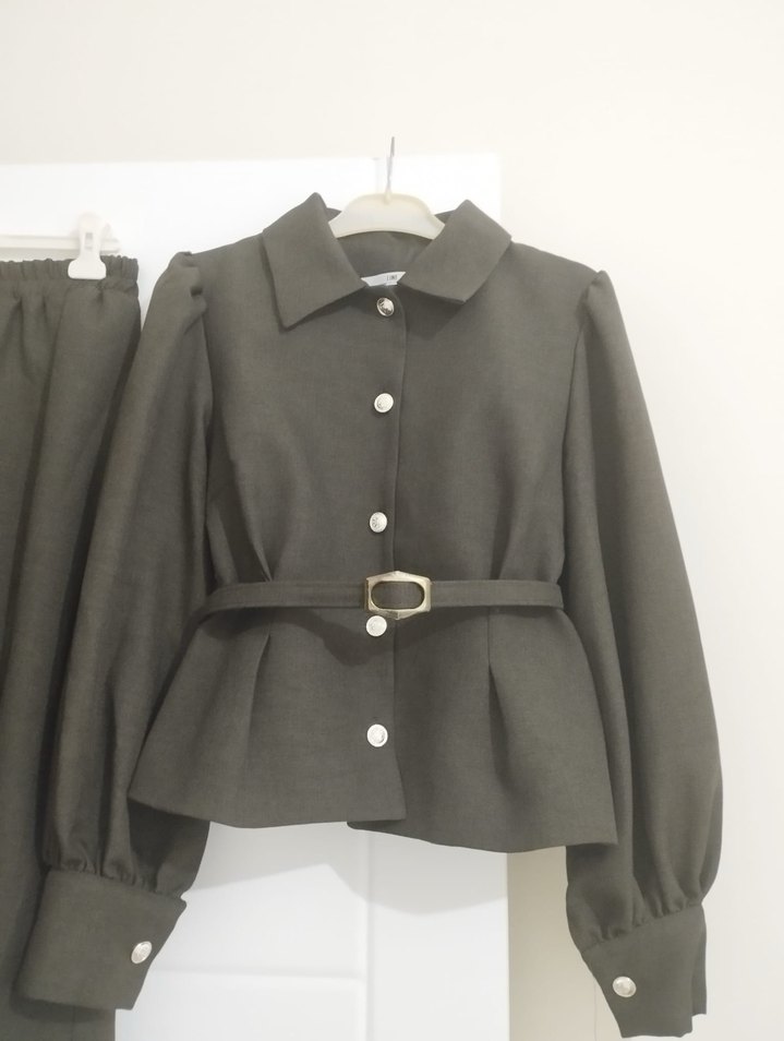 Kadın keten kumaştan, düğmeli ve kemerli mini ceket. Uzun kollu, kesik yakalı ve modern klasik tarzda, ofis için uygun gri renkte. Ustu 38 alto 40 beden .